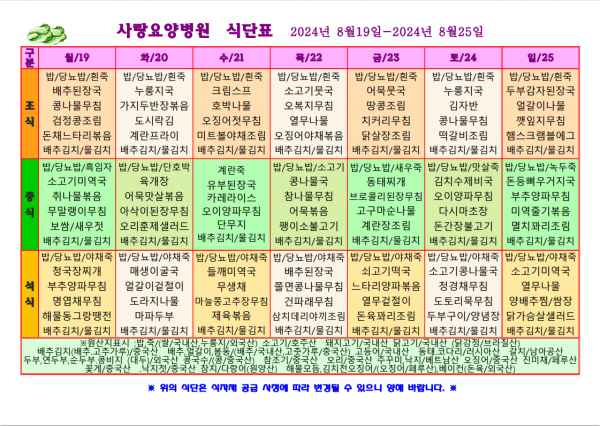 사랑요양병원 8월 넷째주 식단표